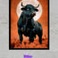 Un toro imponente se alza bajo la luna llena, símbolo de fuerza, orgullo y poder indomable. El contraste entre su figura oscura y el fondo rojo ardiente crea una escena mística y poderosa.
