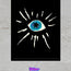 Un ojo en tonos azules intensos se abre en medio del fondo negro, irradiando líneas como rayos de visión o energía. Este diseño enigmático y moderno evoca intuición, poder interior y misterio. Ideal para espacios creativos, rincones esotéricos o decoraciones con actitud.